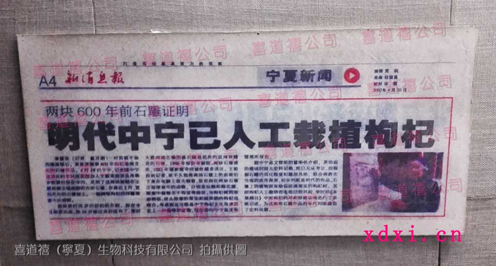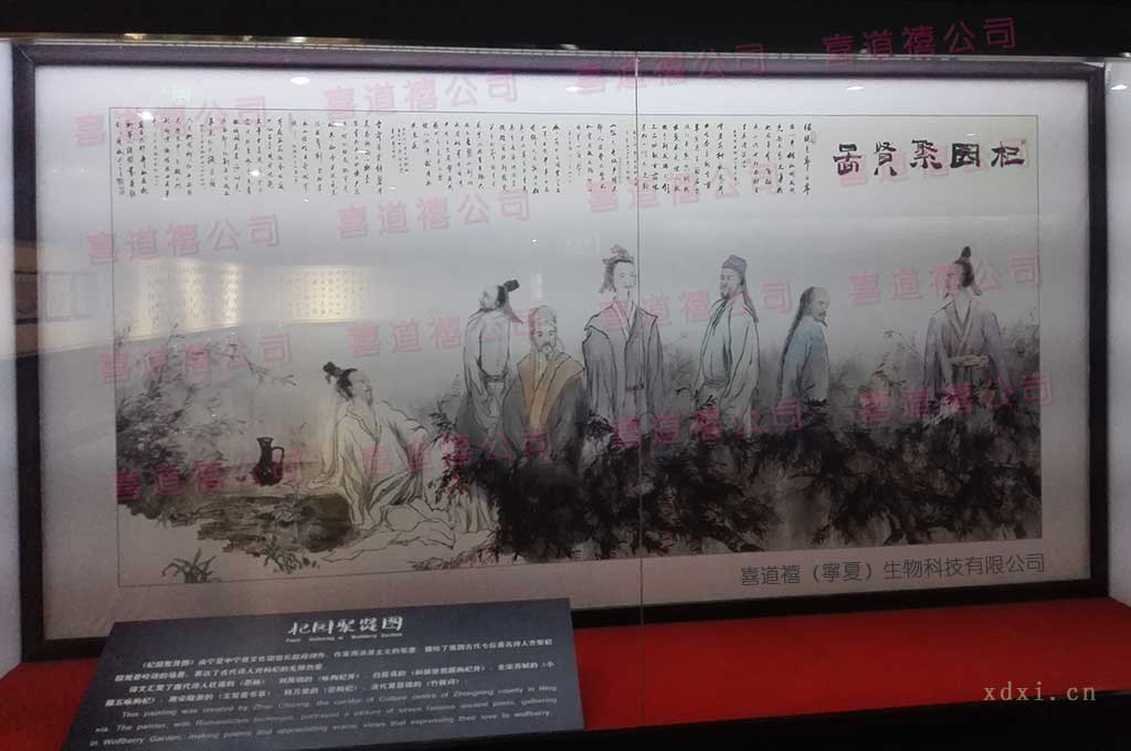 千載原產,寧夏載譽。美哉喜道禧,海內名品。玆非數戶之作坊,已成巨額之產業;遙嗅杞薌,如入芳園;觀其晾曬,若臨紅海。藍天白雲,煦日濯溫,以搾水兮柔緩芳干;微施翻抄,以催干兮不傷維素;急入冷房,鼓寒風以鎖鮮;源源凜冽,萃干紅瑪瑙;珠璣入篩,恰上擋下漏,三道五坎,為去瑕分級;瑪瑙落槃,粒粒珠璣紅艷;排若蜂房,陣列雁翎,清香彌散,紅艷氛圍,聞吸芬芳,瞻閱喜氣。鮮杞源源以相出兮,遂入精美之包裝;金匣排排似儲玉璧兮,共嘆名品之堂皇。乃援筆而賦長句兮,讚喜道禧之養生聖品;厲數十載,堪稱養生珍饈葯食兮,喜萬里之同享。